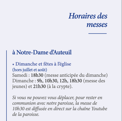 Horaires des messes à Notre-Dame d'Auteuil et dans le quartier.