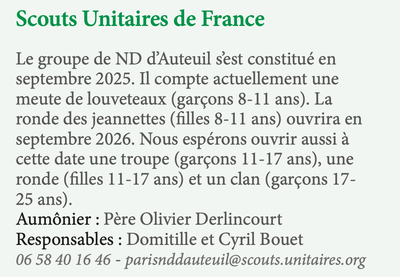 le groupe Scouts Unitaires de France de Notre-Dame d’Auteuil accueille scouts, louveteaux, jeannettes, chefs et cheftaines désireux de vivre une aventure authentique.